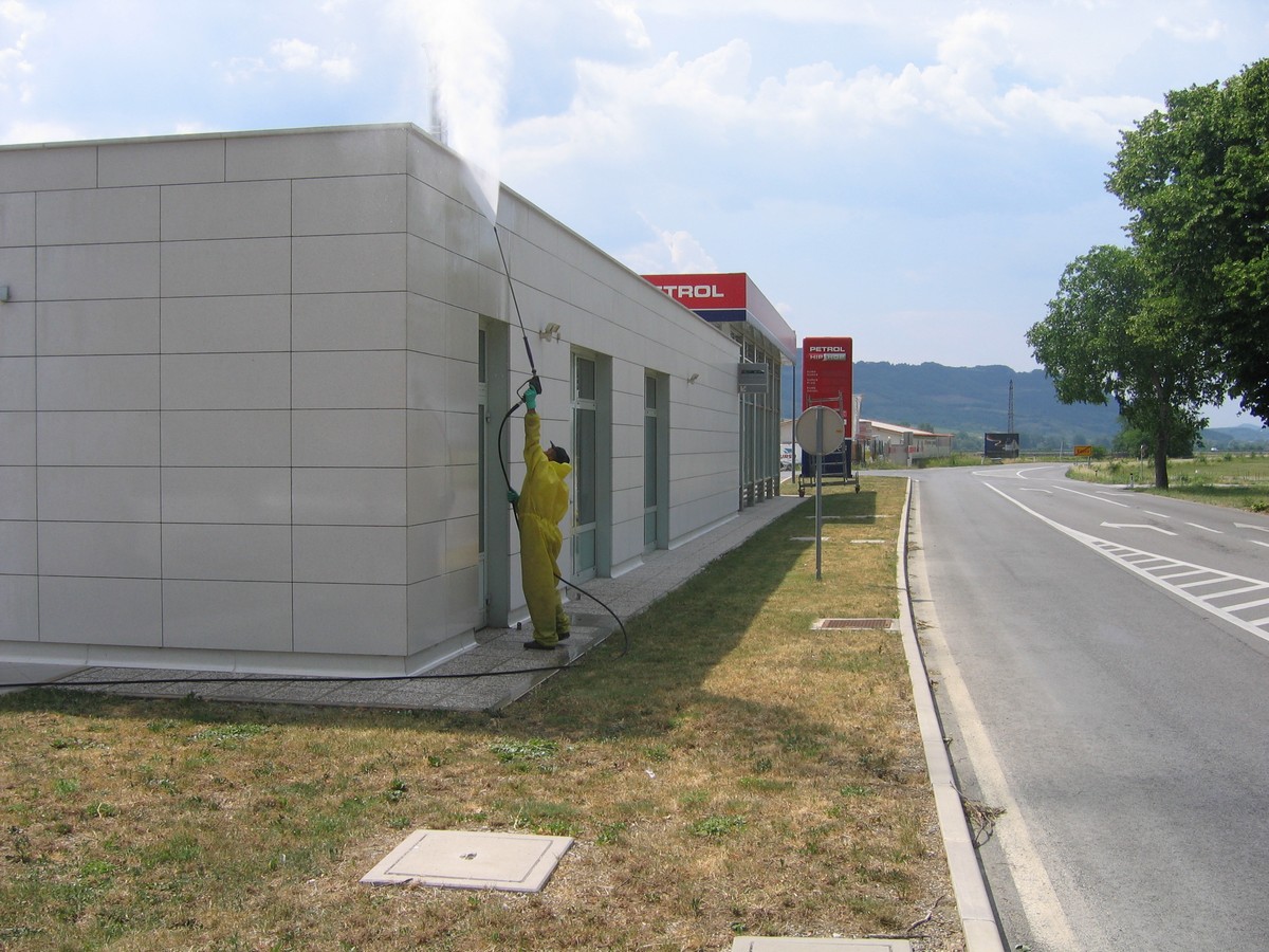 Pri visokotlačnem čiščenju je zelo pomembna pravilna uporaba šob in pritiska. Zato skoraj vedno naredimo testno polje, da lahko določimo način čiščenja. Nekatere fasade je potrebno najprej "namočiti", pri drugih je potrebno dodati čistilo, nekatere pa se čistijo z zelo malim pritiskom, vodo je potrebno segreti do 100C. Najbolj pomembno je pravilno razmerje med pritiskom in količino vode, da se fasada lepo spere.